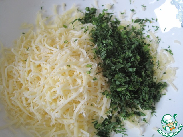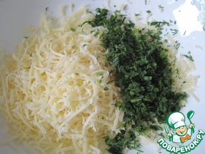 Сыр с чесноком натираем на терке, добавляем измельченную зелень.