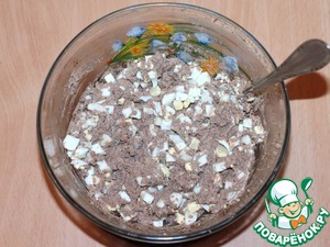 7. Нарезаем мелко очищенные яйца и добавляем в фарш, аккуратно перемешиваем. Можно добавить в готовый фарш, мелко порубленный зеленый лук. Фарш готов.