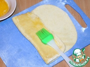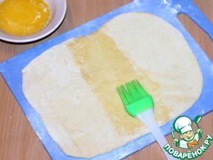 9. Разделить пласт теста на 3 равные части, и не разрезая его, а только намечая линии спинкой ножа. На среднюю часть пласта нанести предварительно подогретое масло.