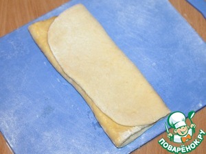 11. Накрыть его свободным правым пластом. Должна получиться закатка, состоящая из трех слоев теста и двух слоев масла. Снова раскатать пласт и повторить. Проделать раскатку еще 2-3 раза в результате чего образуется пласт с 15... слоями. в зависимости от того, каким вы хотите получить тесто.