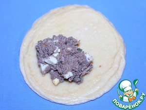 13. В середину круга положить начинку (1,5 ст. л.), края теста смазать яйцом,