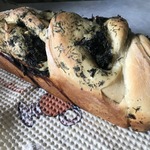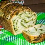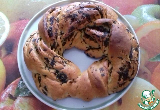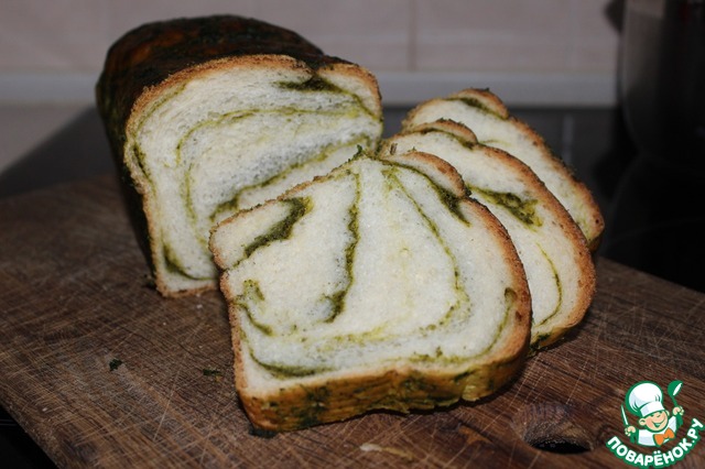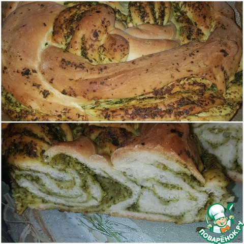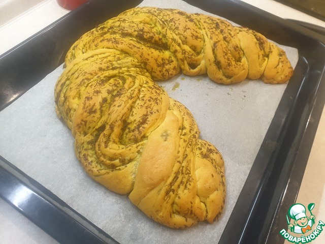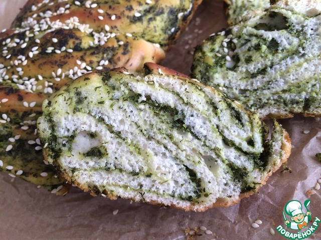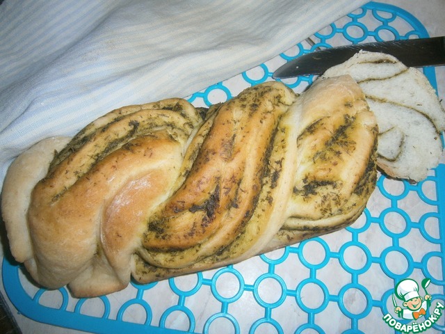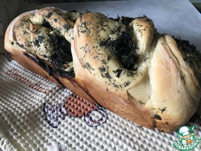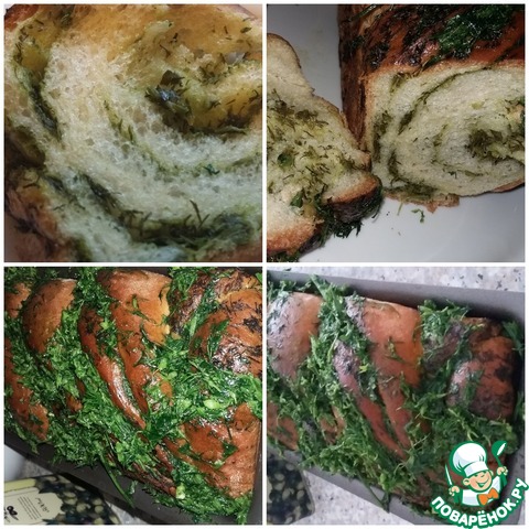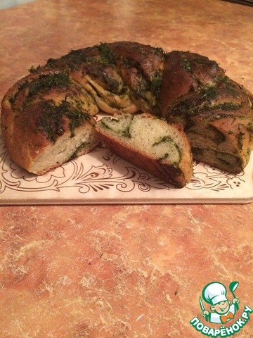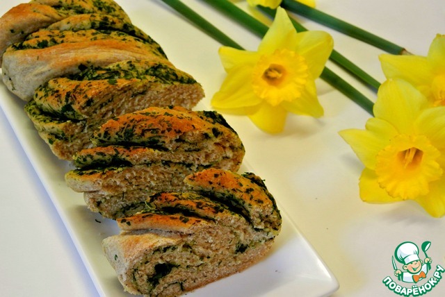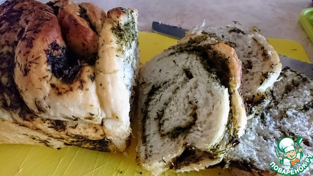 Готовое тесто раскатать в овал, по его поверхности распределить зелень. оставьте немного зеленой массы для обмазывания уже готового хлеба, так он будет еще ароматнее.
