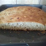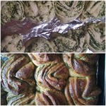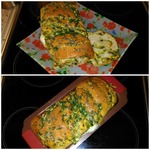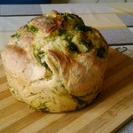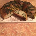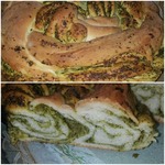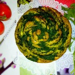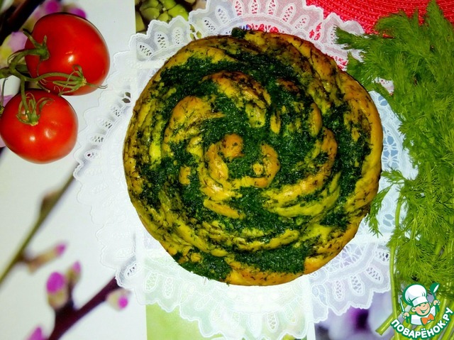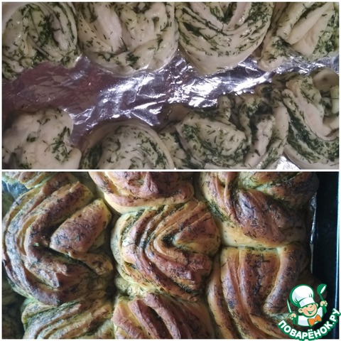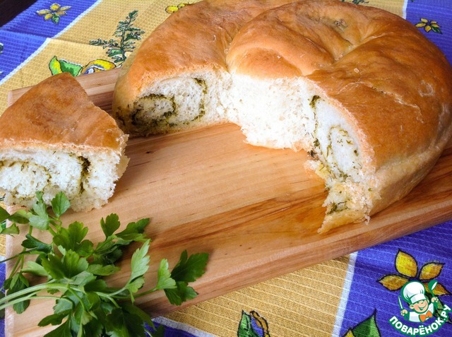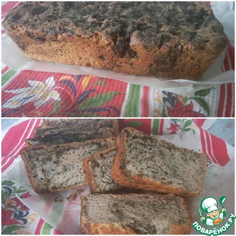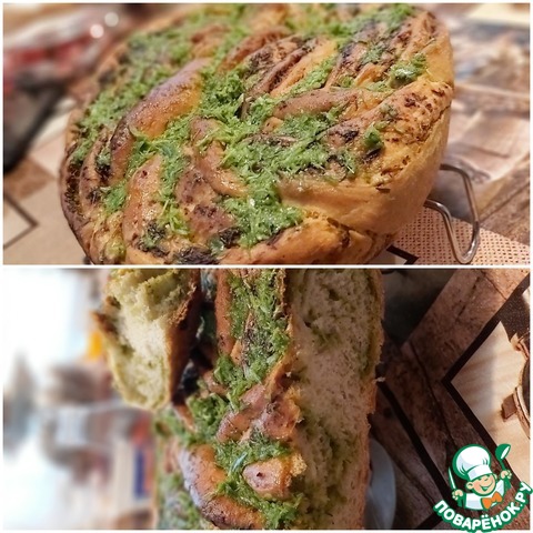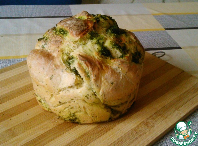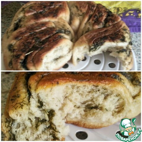 Поставить форму в теплое место для подъема теста. У меня поднялось за 35 минут. Выпекать в предварительно разогретой духовке до 180 градусов, 40 минут. После выпечки достать из формы и обмазать молотой зеленью.