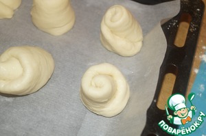 Скатать в рулетик и разрезать пополам. Выложить булочки на противень застеленный бумагой для выпечки. Нужно оставить некоторое расстояние между заготовками, чтобы они могли подойти и не слиплись. Дать им подойти в течении 30 минут, накрыв их влажным полотенцем. Смазать взбитым яйцом.
