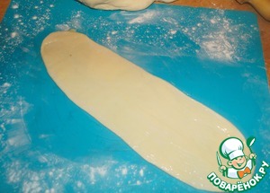 Отщипнуть от теста кусочек, размеров с теннисный мячик и раскатать его в полоску. Смазать полосу растопленным сливочным маслом.