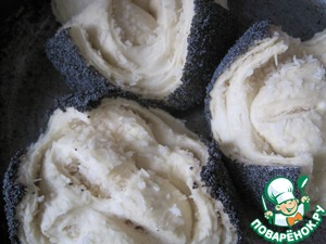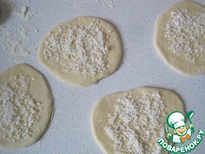 • Формуем булочку из 4 лепешек. Каждую лепешку смазываем растительным маслом, посыпаем кокосовой стружкой.