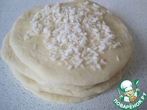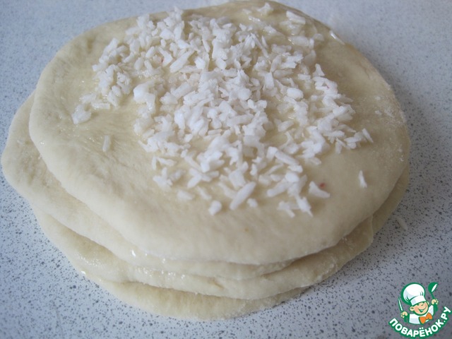 Формуем булочку из 4 лепешек. Каждую лепешку смазываем растительным маслом, посыпаем кокосовой стружкой.