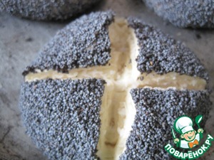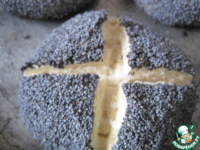 Делаем крестообразный надрез. Я разрезала достаточно глубоко, и у меня булочка сильно раскроется в процессе расстойки. Если не хотите сильного раскрытия, делаем небольшие надрезы.