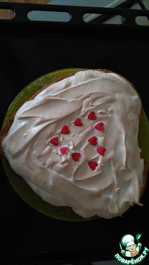 • Глазурь: взбить Сильно Охлажденные белки ( это залог успеха!) с сахаром до очень густой пены ( чтобы не выливалось совсем!). Корж вынуть из формы, наполнить начинкой, сверху распределить взбитые белки. Поставить в разогретую духовку ( прямо на блюде, ничего с ним не случится) и слегка запечь до коричневатого оттенка, минут 5, но постоянно посматривать, чтобы не перебежать. Охладить в холодильнике часов 8.