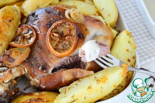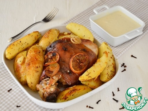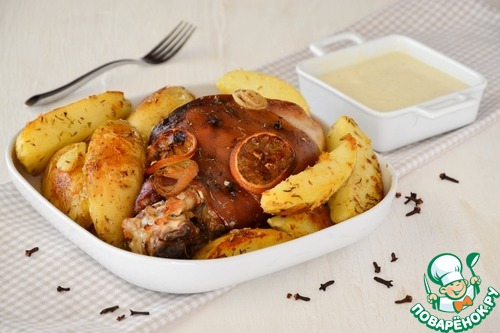 Рецепт этого блюда случайно попался мне на глаза несколько дней назад. Картинка была настолько аппетитная, что я не смогла удержаться, чтобы не попробовать это блюдо. Результат так нам понравился, что не поделиться этим рецептом с вами, было бы неправильно. Итак, ароматная свиная рулька, запеченная в духовке, с гармоничным соусом из феты, а на гарнир мы приготовим замечательную картошечку!