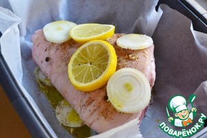 Лук и лимон нарезаем кружками и выкладываем на и под рульку.