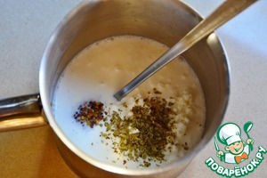 Подогреваем в кастрюльке молоко, добавляем фету, горчицу, майоран. Варим соус в течение нескольких минут после закипания, постоянно помешивая.