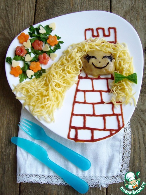 • Макароны будут волосами Рапунцель, и мы их украсим бантом из огурца. Затем создадим цветущий сад на листьях петрушки из вырезанных овощей. И вот наша красотка Рапунцель готова во всей красе)))