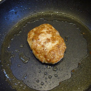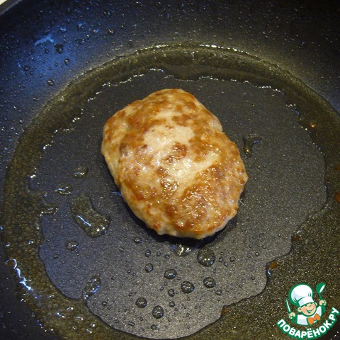 • Фарш посолить, сформировать котлету и пожарить на сковороде до готовности.