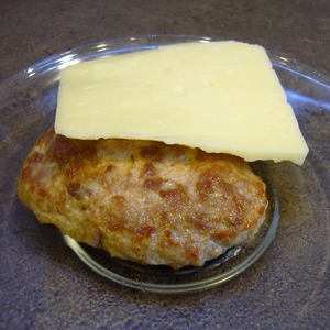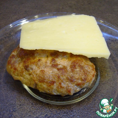 • На готовую котлету положить кусок сыра и поместить ее в микроволновку на 20 сек. (чтоб сыр расплавился)