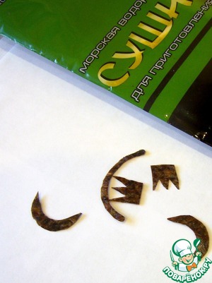• Вырезать из листов нори глазки, носик, ротик и положить их на лицо (котлета с сыром)