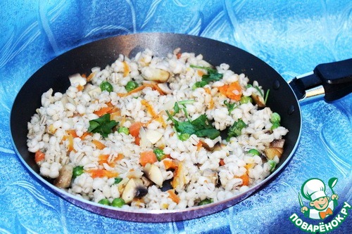 Добавляем промытую перловку, прогреваем несколько минут. Овощей у меня вышло ровно столько, сколько перловки. А всего блюда большая сковородка. Но она очень быстро "исчезла", не сама сковородка, правда, а содержимое)) А мой старший сын сказал, что вкуснее каши не ел. И через полчаса попросил еще одну порцию. Для меня это лучший показатель)))