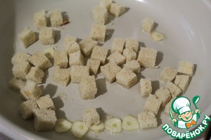 Разогреть сковороду с растительным маслом, обжарить чеснок, всыпать кубики батона и обжарить -