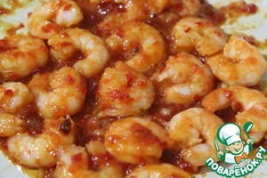 Сковороду слегка смазать 1 ст л оливкового масла и на сильном огне быстро обжарить креветки, влить соус, перемешать и обжарить по выпаривания.