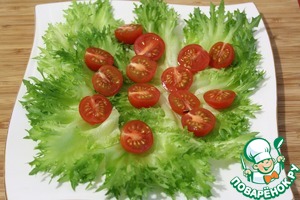 На листья выкладываем черри и поливаем заправкой
