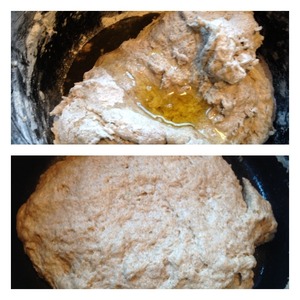 Влить масло и вымешивать тесто до тех пор, пока оно полностью не впитает в себя масло. Оставить тесто в теплом месте, пока оно не увеличится в объеме в 2 раза.