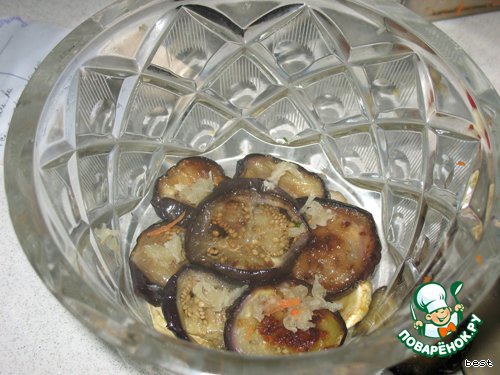 Баклажаны порезать кругляшками около 1-1,5 см, слегка присолить, сложить их в миску и поставить под пресс, чтобы дали сок. Затем их промыть, промакнуть салфеткой и обжарить на растительном масле до золотистого цвета.