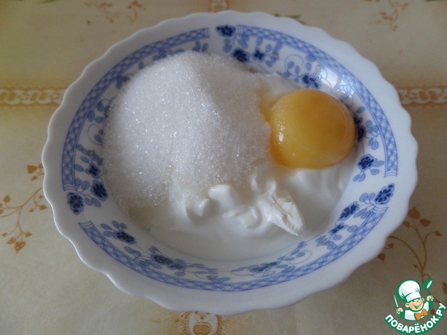 • В чашку выкладываем сметану, сахар и яичный желток. Перемешиваем.