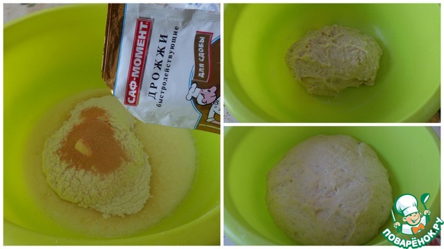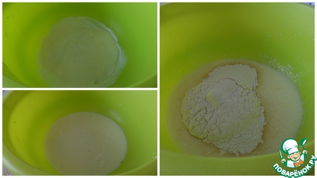 • Поверх муки добавляем дрожжи. Просеиваем в чашку оставшуюся муку. Замешиваем тесто. Ставим в теплое место на 1-1,5 часа, накрыв полотенцем.