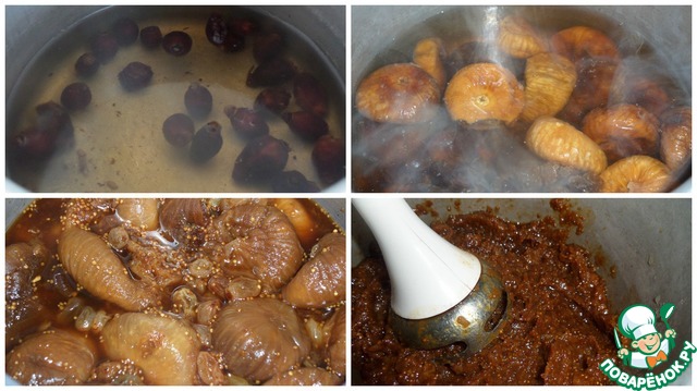 • В кастрюлю наливаем 400 мл воды, кладем промытый шиповник. Ставим на огонь. Варим 10 минут после закипания. Процеживаем. В полученный отвар кладем промытый инжир и изюм. Варим 10 минут после закипания, добавив 1 ст. л. сахара. Остужаем. Измельчаем с помощью блендера или мясорубки ( сливаем отвар и добавляем постепенно, регулируя густоту начинки).