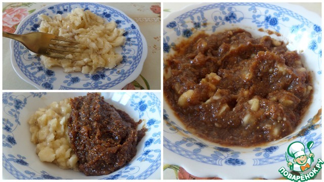 • Очищенный банан разминаем вилкой. Выкладываем в чашку банан и смесь из сухофруктов. Перемешиваем. Начинка готова.