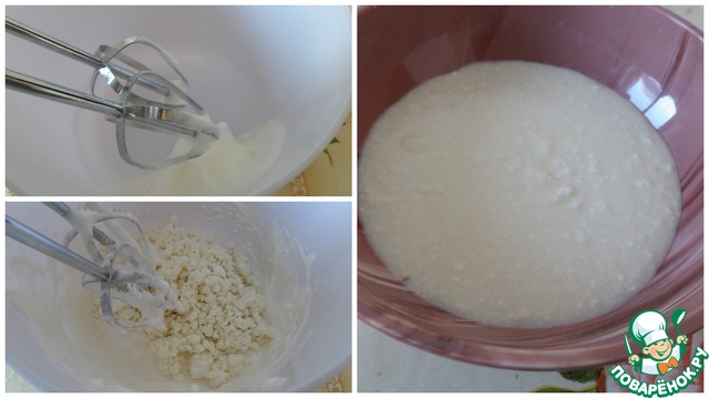 • Яичный белок взбиваем с 3 ст. л. сахара. Добавляем творог. Перемешиваем. Начинка готова.