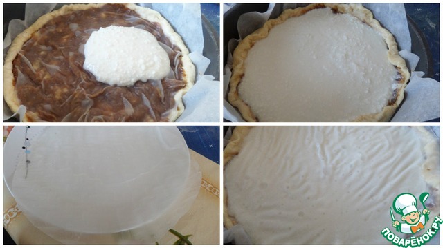 • Поверх рисовой бумаги выкладываем творожную начинку. Накрываем вторым листом рисовой бумаги, подготовленным так же.