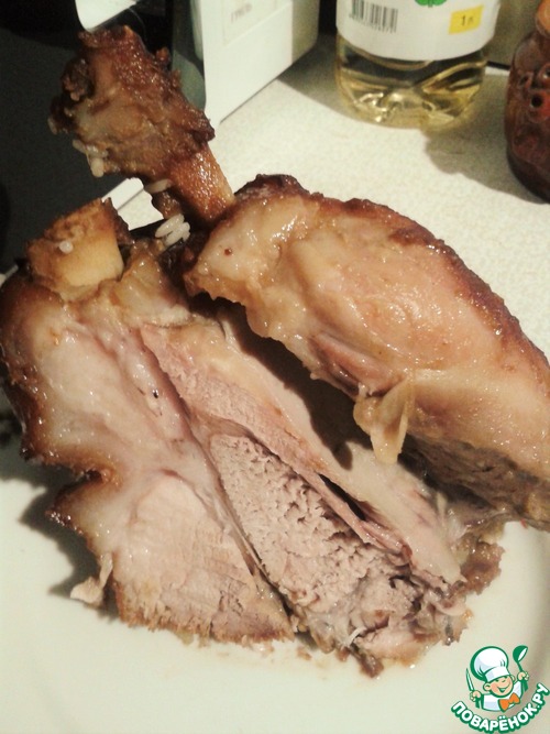 Всё делала по рецепту, в конце запекания только добавила для хрустящей корочки обсыпку из сухарей и тёртого сыра. На второй фотографии видно насколько легко мясо отделается от косточки, буквально от одного прикосновения ножа.