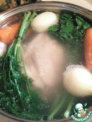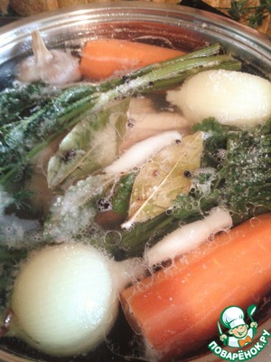 Открываем, добавляем в воду по паре целых морковок, луковиц, головку чеснока, по пучку укропа и петрушки.