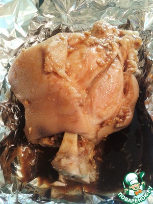Форму выстилаем фольгой так, чтобы потом можно было этой фольгой полностью завернуть рульку. Рульку достаем из бульона, выкладываем в форму и еще горячей обмазываем маринадом. Оставляем ее пропитаться на 15-20 мин.