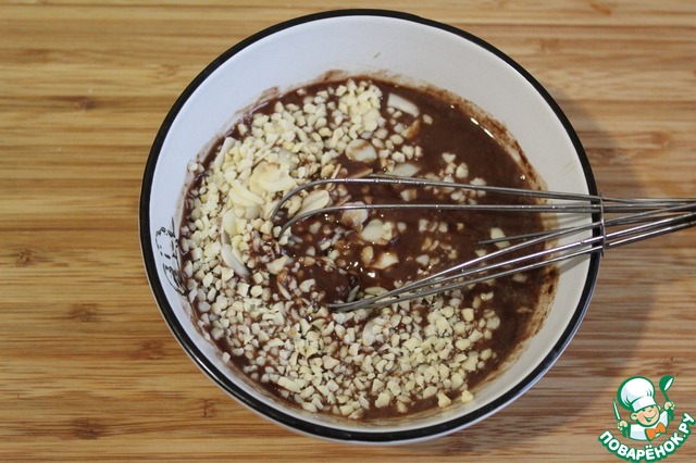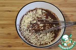 Соединить яйцо, шоколад, растопленное масло и орехи, перемешать
