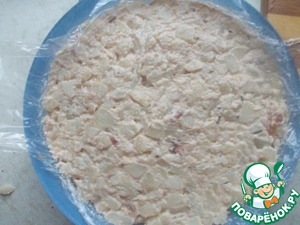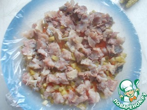 Отправляем в холодильник на 30-40 минут, чтобы салат пропитался. Переворачиваем на тарелку и снимаем пленку.