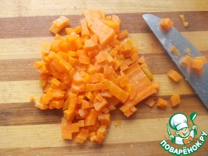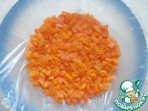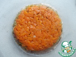 Форму или порционную тарелку выстилаем пленкой и укладываем слой моркови. Можно взять маленькие пиалки или чашки и сделать более маленькие порции.