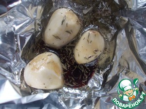Чеснок мы почистим и отправим в фольгу с маслом, тимьяном и бальзамиком. Заворачиваем фольгу и запекаем минут 20 при 200С до мягкости чеснока. Это можно сделать заранее.