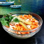 Очень вкусный и простой салатик! Очень интересная заправка из печеного чеснока, которую готовлю к летним салатам с помидорами, но и тут она подчеркнула вкус как нельзя лучше. Украсила кактусами, салатик стал от этого еще и веселым!