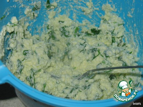 Творог смешать с мелко порезанной зеленью, добавить майонез, давленый чеснок, посолить.