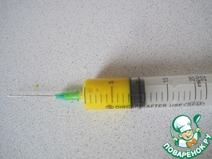 Погружаем шприц практически до дна, слегка нажимаем и вытаскиваем иглу. Если немного желе вытечет на поверхность вытираем салфеткой.