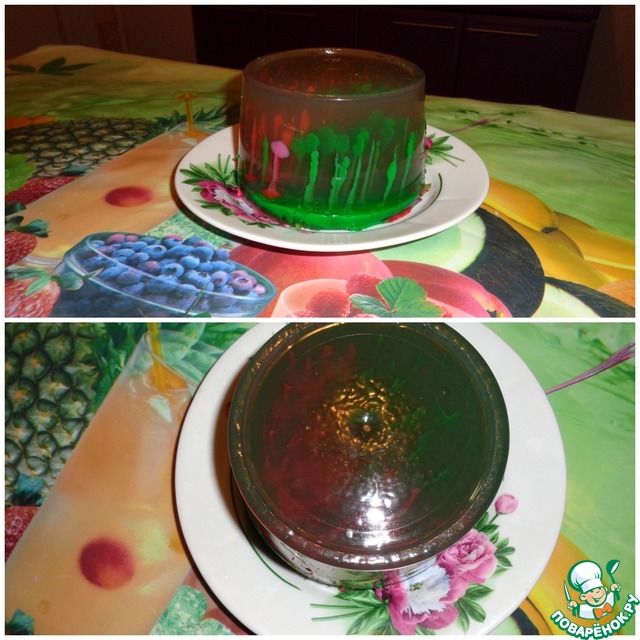 Чтобы вынуть желе из формы, тарелку на несколько секунд опускаем в горячую воду.