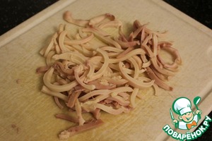 Пока варится картофель, почистим кальмара и нарежем соломкой. Кальмар готов к следующему шагу. Но торопиться не будем.