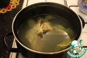 Сварим бульон. Для этого возьмём любимую часть курицы на 1,5 л холодной воды. Например, если хотите больше мяса, то грудку, а я предпочитаю более наваристую спинку. После закипания варим несколько минут, выключаем, курицу перекладываем в тарелку, а кастрюлю моем и наливаем чистую воду, в которой продолжаем варить курицу, добавив лавровый лист и головку репчатого лука (я разрезала на 4 части, но можно и целую). Посолите бульон вполовину меньше Вашей обычной нормы. На мою кастрюлю я добавила половину столовой ложки соли. Вторую половину нормы мы покроем за счёт соевого соуса, который добавим позднее. Также добавим по 3 горошины чёрного перца и душистого перца.