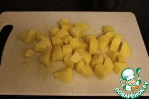 Когда грибы будут готовы, добавим нарезанный кубиками картофель. И остальные специи: щепотку молотого имбиря, веточку сухого эстрагона (тархуна) и щепотку сушёной мяты. Эти травы очень ароматные, поэтому лучше взять совсем чуть-чуть и добавить ближе к окончанию готовки.