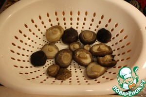 Подготовим грибы. Так как шиитаке были замороженные, опустим их на пару минут в кипящую воду (в отдельную кастрюлю!). Большие шляпки разрежем на 2-4 части соломкой, маленькие оставим целыми, закинем грибы в кастрюлю с бульоном.