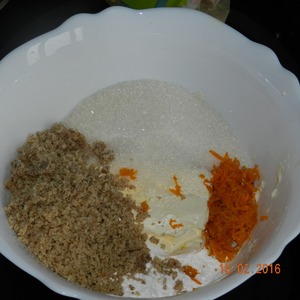 Теплое сливочное масло перемешиваю вилкой с сахаром, крахмалом, грецкими орехами и цедрой. -