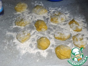Затем тесто формируем в колбаску и отделяем шарики размером с небольшой мандарин, у меня получилось 12 шт
