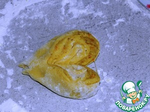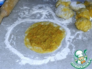 Каждый раскатываем диаметром 15 см и кладем 1 чайную ложку начинки, распределяя по кругу